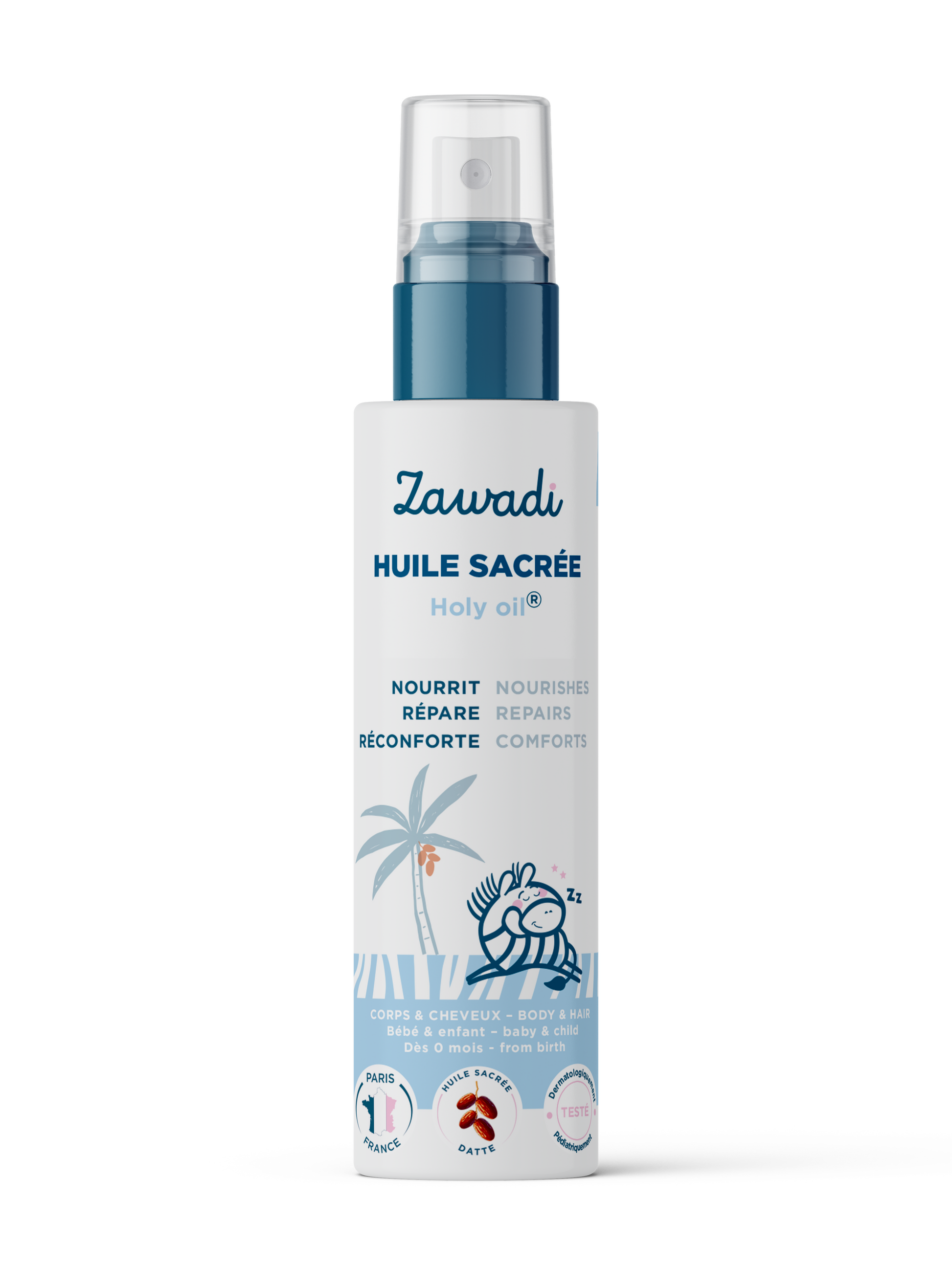 Geboren uit een dubbele Gepatenteerde anti-kras®-technologieën + heilige olie® op basis van heilige dadelolie , rijk aan omega's, vitaminen, mineralen en ceramiden om de ontspanning van de baby te bevorderen, de gevoelige huid te verzachten en huidirritatie te herstellen.